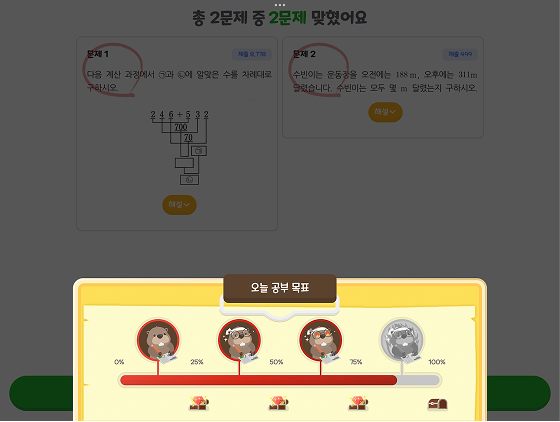 게임처럼 공부를 할 수 있다는 게 너무 재밌고 신박한 거 같아요. 점수마다 루비를 받아서 많이 받으면 기분이 좋고 틀린 문제는 바로 풀 수 있어서 좋았어요! ^ㅡ^